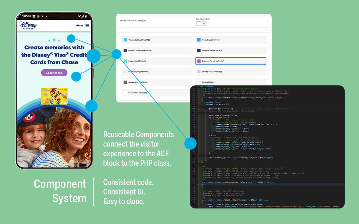 Harnessing the power of ACF's Flexible Content, I extended the existing custom block system by building a component system which is consistent and reusable by blocks and components alike. It was super simple to retrieve the data and call the template from the backend, but just as easy to clone from ACF.